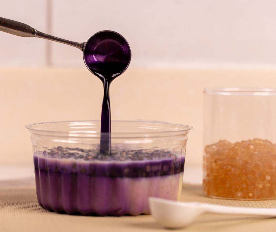 The original Filipino healthy soy pudding topped with ube halaya syrup and tapioca pearls.